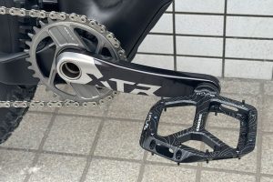 駆動系はNew XTRのエンデューロ系のクランクセット:FC-M9220(170㎜/32T)とSM-BB94 PFボトムブラケット、リアディレーラーは的確かつ高速な変速性能を持つ:RD-M9250 Di2 SGS とシフトスイッチにSW-M9250R、カセットスプロケットにCS-M92000(10~51T)とCN-M9100チェーン、ペダルは軽量でグリップに優れるRACEFACEのATLASペダルを選択。