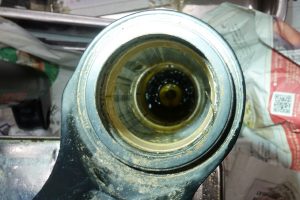 上の画像は、フロントフォークのスタンチオンを抜いた後のアウターレッグの内側の画像です。