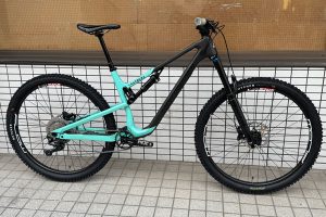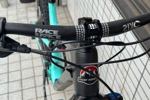 前後ホイールは、GLCハブとStan’s Mk3リム、DT Swiss スポークで組み上げたカスタムホイールに、ハンドルはRACEFACEのSIXCカーボンハンドルにカスタマイズしてあります。