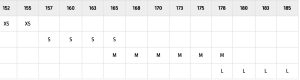 こちらはスペシャライズドの身長とバイクサイズの適応表です。