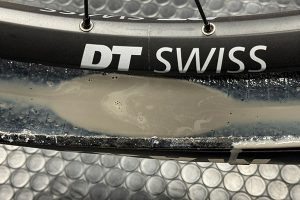 上の画像は、約1年ほど使用したチューブレスタイヤの内側に溜まっている透明な液体はシーラントの基材です。
